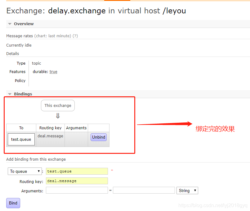 这里不需要配置"dead letter routing key"否则会覆盖掉消息发送时携带的routingkey,导致后面无法路由为刚才配置的delay.exchange
