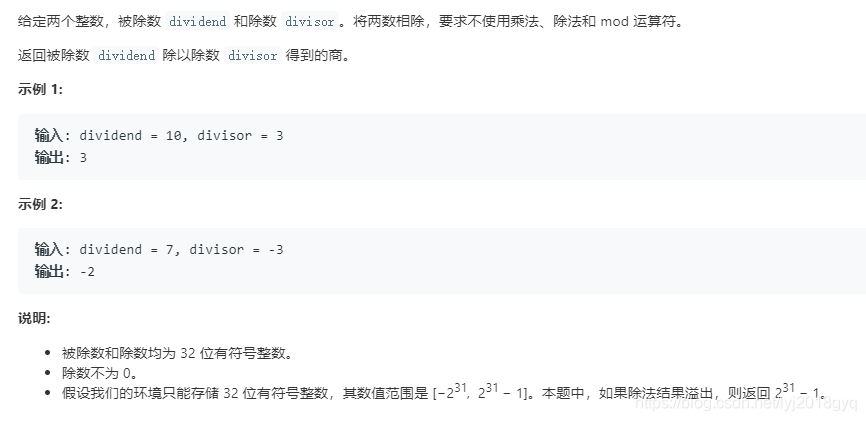 的大小,让计数器累加,不满足条件跳出循环即可。先对除数和被除数进行处理,都取绝对值,最后返回结果的时候再处理,因为题目设置的是整数范围,所以为了确保处理的正确性,使用