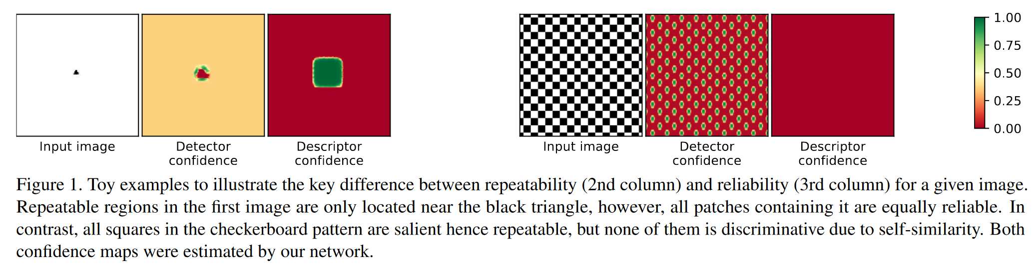 本篇文章提出了同时完成稀疏特征检测和特征描述(detect-and-descibe),作者认为显著的区域不一定具有判别性,因此会影响描述的性能,所以为描述子添加增加了一个置信度。输出稠密的描述子+可靠性(匹配)和可重复性(检测)的置信度,得到的匹配是两个置信度的最大化。---无监督学习