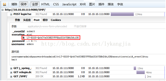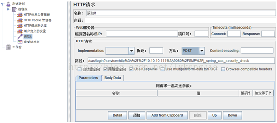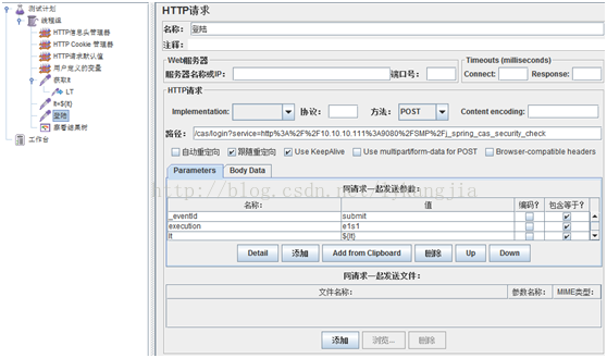 从firebug中可以看出,请求的方法为POST,请求参数中有个动态值lt,首先要解决的就是如何来获取lt的值;下面就用jmeter来模拟下登陆请求;