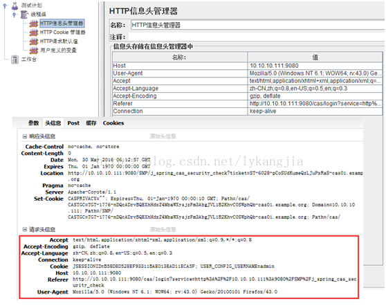 请求头信息管理:复制firebug头信息中的请求头信息到请求头信息管理中,删除里面cookie的内容,因为cookie信息可能是动态的,我们有cookie管理器来管理;