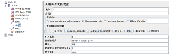 添加正则提取:“获取lt”请求右键,添加-后置处理器-正则表达式提取器;