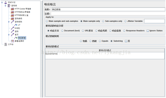 登陆成功后,首页会显示用户名,所以对首页进行断言;首页右键-添加-断言-响应断言,输入参数化的用户名;