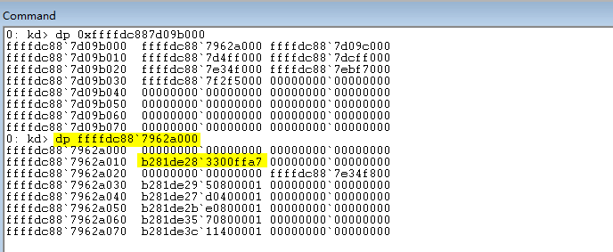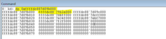 我们对 0xffffdc88-7d09b001 抹去低二位,输入dp 0xffffdc887d09b000 输出的结果就是一张二级表,里面存储的就是一级表指针。