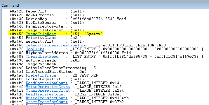 回到WinDBG调试器,输入命令dt _EPROCESS 0xffffb281de283300解析以下这个结构,输出结果是System进程。