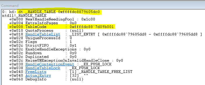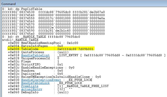 接着我们解析ffffdc88-79605dc0这个内存地址,执行dt _HANDLE_TABLE 0xffffdc8879605dc0得到规范化结构体。