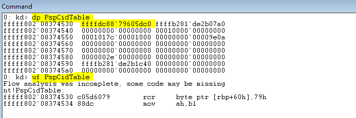 首先第一步先要得到PspCidTable函数内存地址,输入dp PspCidTable即可得到,如果在程序中则是调用MmGetSystemRoutineAddress取到。
