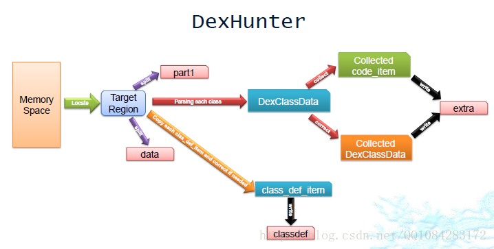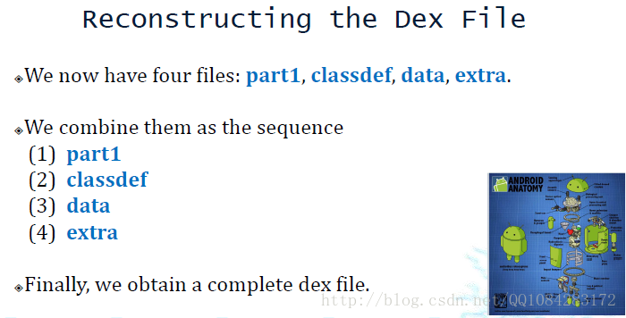 DexHunter脱壳工具内存dump文件产生的文件part1、data、classdef和extra合成脱壳后的whole.dex文件的过程: