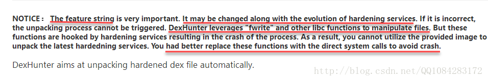 2.DexHunter脱壳工具的第1行---特征字符串(the feature string)一直是在随着加固的对抗在变化的,具体是由当前加固app的pDexOrJar->fileName决定的,按照实际情况来;一些加固像梆梆什么的,会对DexHunter进行检测,检测的方法是检测Android系统的/data/目录下是否有文件/data/dexname,过掉的方式也比较简单,将DexHunter脱壳需要的配置文件dexname改为其他的名称就行;一些加固像梆梆什么的,会Hook一些系统的调用函数如fread、fwrite、fopen等,过掉方式是直接使用系统调用替代掉如:open、write等;一些加固像梆梆、百度什么的,还会采用类成员方法的实现代码抽取的方式对抗脱壳工具(只有代码在需要执行的时候才会被还原,执行完成以后又会被抽去掉)可能会采用比Dalvik_dalvik_system_DexFile_defineClassNative函数更深层的调用函数的Hook,如Hook掉libdvm.so库中dvmResolveClass 函数什么的,导致DexHunter内存dump获取不到dex文件的原代码,因此需要对Hook的dvmResolveClass 函数进行修改才能使DexHunter工具发挥作用。