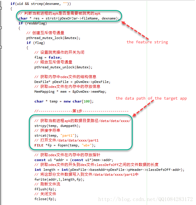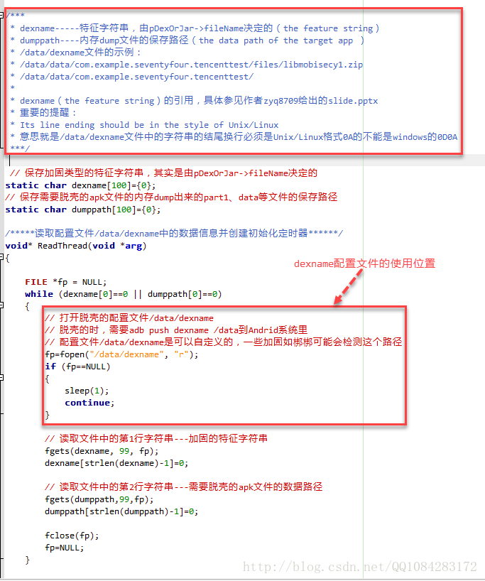 脱壳配置文件/data/dexname的路径和文件名称是可以自定修改的,具体的使用位置见下面的代码截图。dexname文件中包含2行字符串,第一行字符串(the feature string)--特征字符串,是有加固app的pDexOrJar->fileName决定的,第2行字符串是用于内存dump文件如:part1、data、classdef和extra以及最终脱壳文件whole.dex存放位置也即目标加固app的数据目录。特别说下,DexHunter工具的作者在github上说特征字符串(the feature string)在其演讲的ppt--slide.pptx上,但是呢,我觉的不能死板,还是要根据作者的DexHunter中的代码引用为准,按照加固app的实际pDexOrJar->fileName来确定。