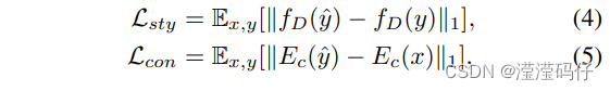 生成的yˆ要符合y的类型,同时保留x原有的内容特征,表述为style loss Lsty和content loss Lcon。其中fD是定义为D的中间层特征上的平均值的样式特征。