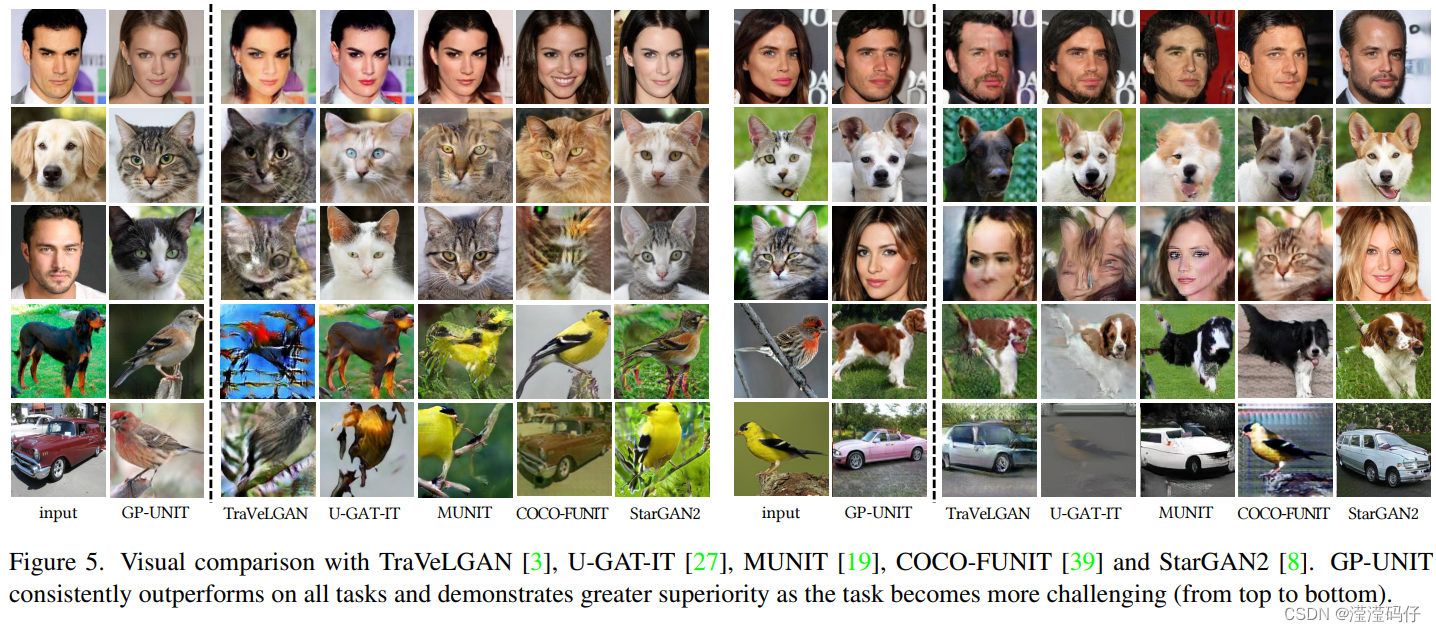 GP-UNIT始终优于所有任务,并且随着任务变得更具挑战性,显示出更大的优越性( 从上到下)。