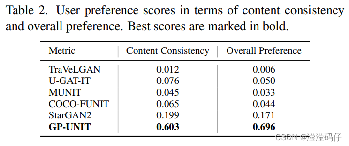 我们进一步进行用户研究来评估输入输出内容的一致性和整体转化性能。共有25名被试参与本研究,从这6种方法中选出他们认为最好的结果,并对50组结果进行了2500次选择。表2总结了平均偏好得分,其中所提方法在内容一致性和整体性能方面都受到显著的偏好。