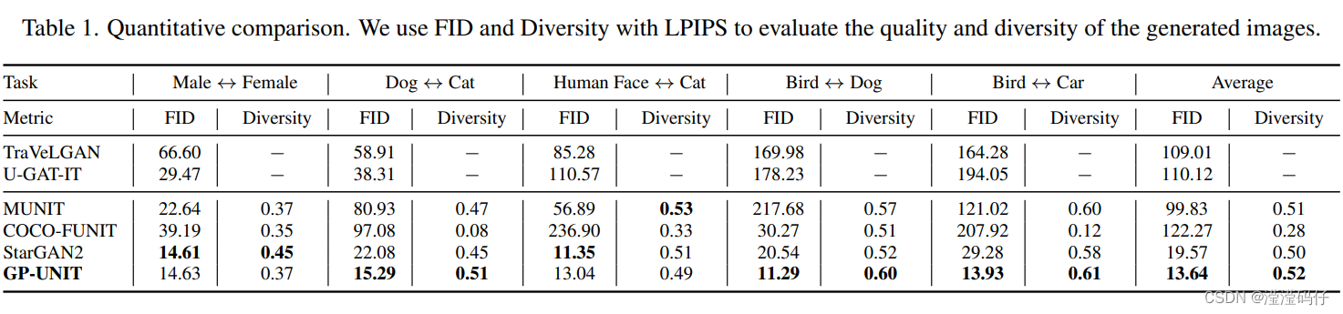 进行质量和多样性的定量比较。FID 和LPIPS 分别用于评价生成数据与真实数据的图片质量与多样性。对于支持多模态转化的方法( MUNIT, COCO-FNIT, StarGAN2, GPUNIT),我们每次测试会生成10个配对翻译结果,我们从随机抽取潜在代码或示例图像来计算它们的平均多样性LPIPS距离。表1报告了所有测试图像的平均定量结果,与图5一致,即我们的方法效果达到或优于对比的方法,在困难任务上的优势更加明显,获得了最好的总体FID图像质量和LPIPS多样性。并发现GP-UNIT倾向于保留输入图像的背景。这种性质不利于多样性,但在某些应用中可能是有用的。虽然StarGAN2在Cat→Human Face上产生了逼真的人脸( 获得最好的FID图像质量 ),但它忽略了与输入猫脸的姿态对应关系( 内容一致性低于 GP-UNIT ),如图5所示。