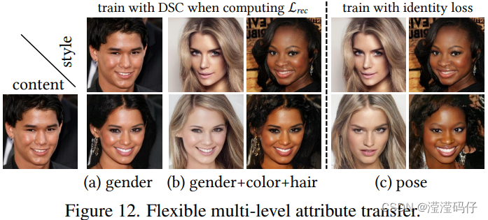 - 在计算Lrec时使用DSC:可以灵活地控制要传递的面部属性( 如图12 ),有助于保存面部内容的个体身份,适用于性别转移和颜色转移。(更注重content,注重细节)