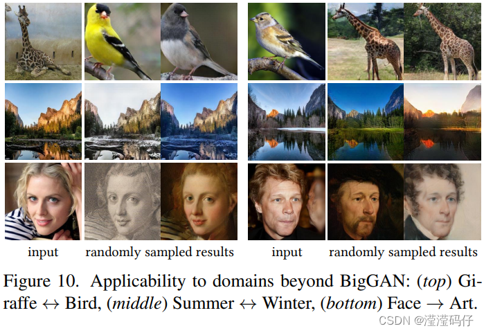 图10展示了物种转移、季节转移和面部造型三个应用。即使MS-COCO长颈鹿、Yosemite景观和Art肖像不在ImageNet 1000类中,同时也不被第一阶段的内容编码器所观测到,我们的方法能够很好地支持这些领域,并产生逼真的结果。
