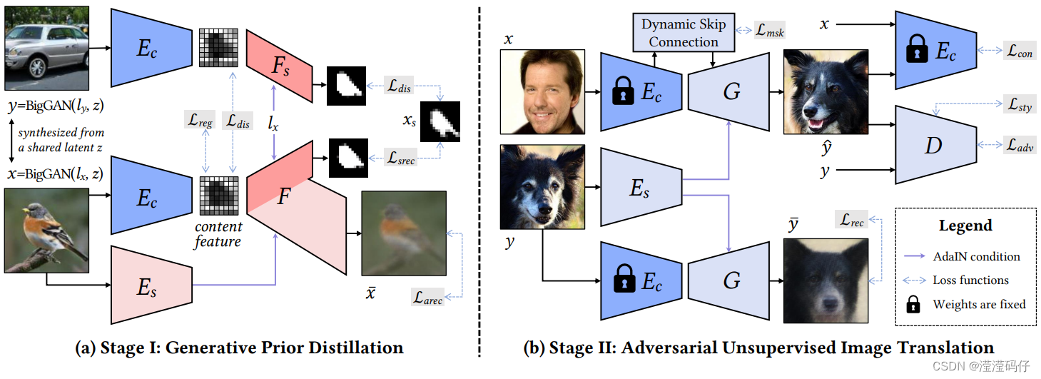 - 训练一个内容编码器Ec来提取BigGAN生成的一对图像它们共享的粗级内容特征,提取出的特征来重构它们的形状和外观。图4(a) 说明了这种用于生成先验精馏的自编码器流水线。