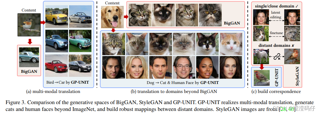 通过生成性先验能克服上述问题,取得可喜成果。生成跨越图像对来挖掘出GAN的独特先验,并利用此来指导模型建立有效的、适应性强的跨类内容映射。