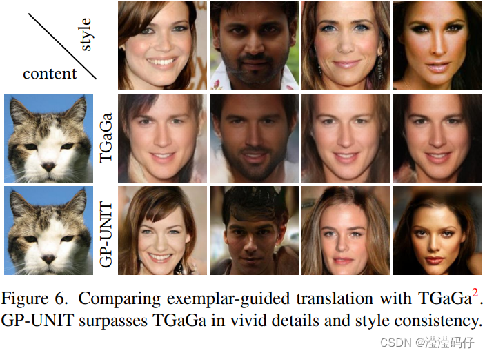- 在图6中,我们将我们的模型与TGaGa 进行了比较,TGaGa 也处理了范例引导转换中的大型几何变形。TGaGa产生模糊的结果,无法精确匹配示例外观,例如所有生成的人脸