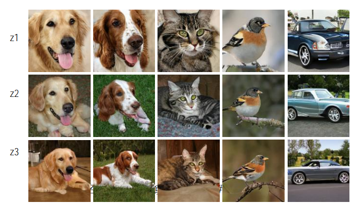 BigGAN生成的对象尽管来自多个领域,但由于是由同样的噪音潜码z生成的,所以也具有高度的内容相关性。图2显示了BigGAN的生成空间,特征是三个噪音潜码(z1,z2,z3),横跨五个领域。其中每个潜码是指对应关系,如狗和猫间可以观察到细粒度的对应关系,如面部特征和身体姿势。而鸟和车辆的对应关系则不同,可以在方向和图像布局方面观察到粗略的对应关系。尽管领域差异大,但是在高度抽象的语义层面也会有对应关系。