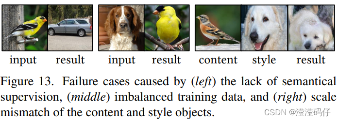 - 比例不匹配问题:当content内容图像和style风格图像中的对象具有非常不同的比例时,一些外观特征无法正确呈现。