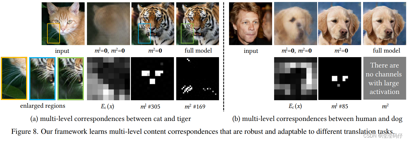 因此,我们的全多级内容特性使我们能够模拟极细级的长晶须。正如预期的那样,在更远的人和狗脸之间没有发现这种精细的对应关系,从而阻止了来自源域不必要的外观影响( 如图 5中生成的猫脸上的衣服 )。需要注意的是,这种合理的、适应性强的语义注意仅仅是通过先前的生成来学习的,没有任何明确的对应监督。