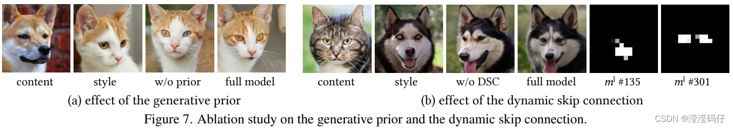 如图7 ( b )所示,在没有动态跳转连接( DSC )的情况下,模型不能保持鼻子和眼睛在内容图像中的相对位置。我们用全模型预测的掩模的第135和301通道有效地定位了这些特征,内容映射更为准确。