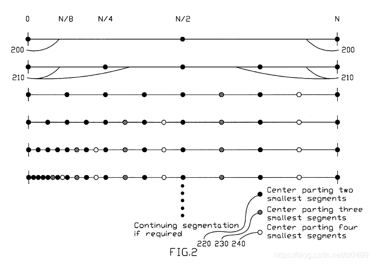 - 按照自适应分段的方法把上述四部分继续划分下去,直到达到预设的最小宽度范围。自适应分段方法由平分两部分220;或/和平分成三部分230;或/和平分成四部分240构成。