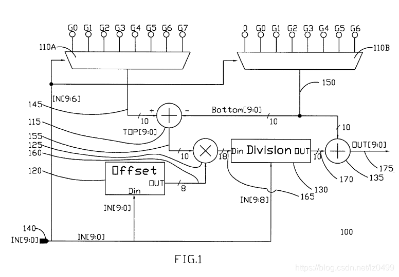 如图FIG1,输入10bit图像亮度数据IN[9:0]140,因此有1024个不同的亮度等级。数据线140与偏移模块120连接,高四位IN[9:6]和高两位IN[9:8]数据分别和数据选择器110和除法器连接。数据选择器数据110存放于ROM中。针对图3而言,G0-G7保存于110A,0-G6保存于110B中,这样可以通过输入数据高四位IN[9:6]在一个时钟内读取到相邻的两个节点的gamma矫正灰度值。高节点所对应的10bit gamma矫正值G(B)145和低节点所对应的10bit gamma矫正值G(A)150。