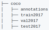 将注释压缩包,train图片和val图片的压缩包解压放在coco/里面,就像下面的文件路径一样: