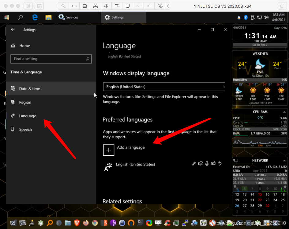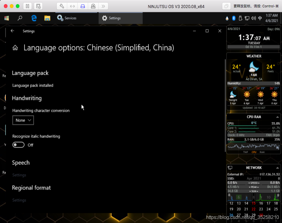 本文详细介绍了如何在虚拟机中安装红队渗透工具库-忍者安全系统NINJUTSUOSv3,并提供了系统安装和安装中文包的步骤。系统安装过程中包括选择语言、设置密钥和分区等步骤,而安装中文包则涉及启动Windows Update服务、添加语言包和设置中文为主语言。尽管安装完成后并非所有界面都完全汉化,但主要部分已转换为中文。