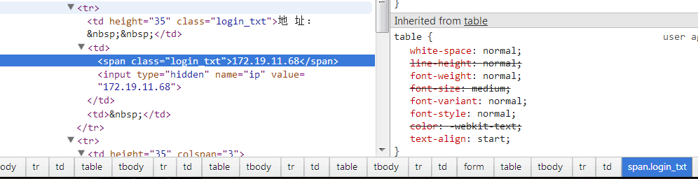 看到下面的标签层层递进,ip地址在一个叫名叫span,class为login_txt下的text中。