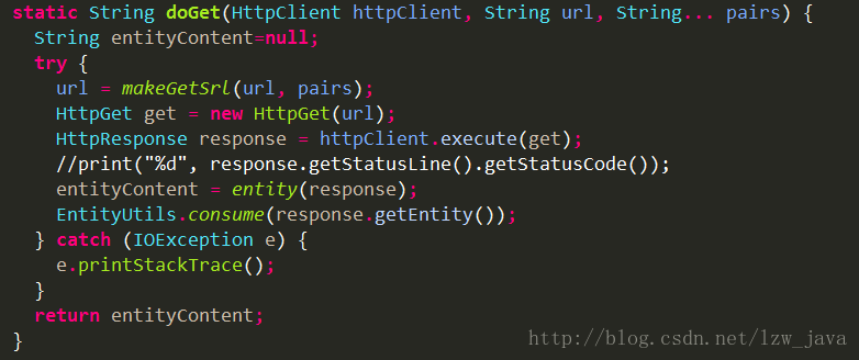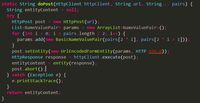 post把请求的键值对保存在entity中。这里的post.abort()把post中断掉。因为后面我们还要用这个httpClient来发送请求,而org.apache的http相关类又想尽可能地复用httpConnection,所以当一个请求还没终止的时候,又去发送另一个请求,会发生异常。我也不是很懂。。