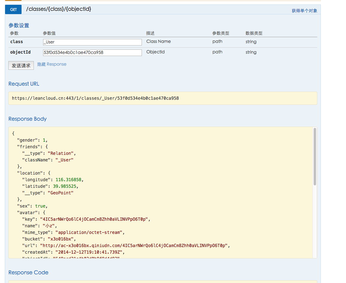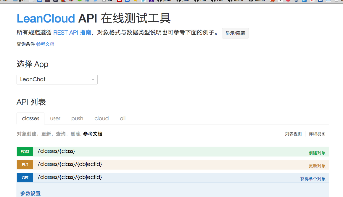 LeanCloud 还有特别好用的API在线测试工具,比如针对上面的请求,我们迅速找到相应的API,