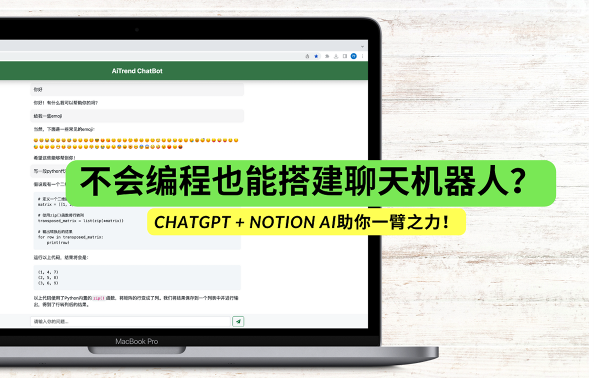 不会编程也能搭建聊天机器人?ChatGPT + Notion AI助你一臂之力! 本文主要谈关于如何使用ChatGPT(实际使用主力工具为Notion AI),应用官方API接口,搭建一个完整的聊天机器人。本文的核心目的不是教会读者如何去搭建一个机器人,而是学会如何使用Notion AI去辅助自己编程,或者解决更多的问题。并由此谈一谈我在使用过程中的一些心得。