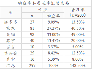 除了上述的基本百分比分析之外,还可进一步利用深入分析。比如本次案例里面98个样本选择‘天猫’,总样本是200个,占比是98/200=49%。这种百分比叫做‘普及率’。除此之外还有一种占比叫做‘响应率’,如下图: