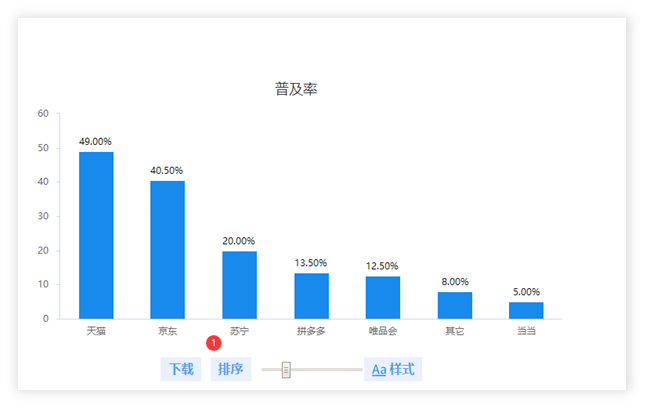 上图展示了各项的选择比例,‘天猫’的占比最高为49%,即说明网购平台中天猫的使用率最高,其次是‘京东’,占比是40.5%。除了使用柱形图进行展示,也可以使用条形图,并且对数据进行排序展示等。