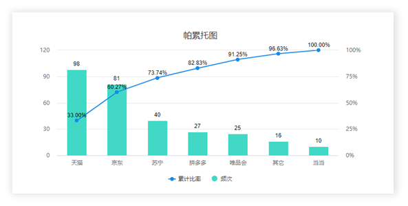 在多选题设计时,很多时候我们想找到某个问题发生的原因,比如说银行服务柜台不满意的地方有哪些?多选题选项分别有:服务态度、等候时间、银行网点少等等很多个原因,从银行角度来看,出现客服对于柜台不满意的原因有很多,首先需要抓住重要的原因,可根据2/8原则进行分析,20%的事情导致了80%的不满意,比如服务态度这一项做好了,可能客服的满意度就会提升80%,帕累托图正是基于2/8原则进行分析。