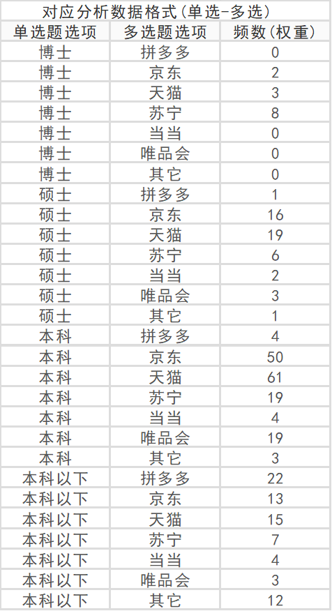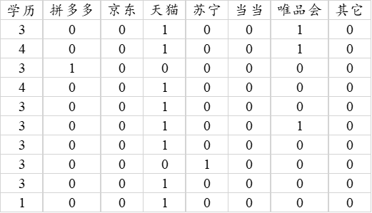 本次网购平台偏好这个多选题共有7个选项,因此数据中有7列。除此之外还有一个学历单选题,单独占一列数据。学历中的数字,数字1代表本科以下,数字2代表本科,数字3代表硕士,数字4代表博士。