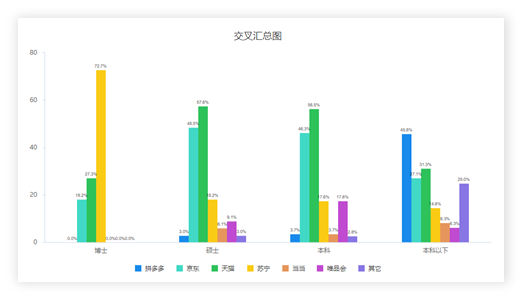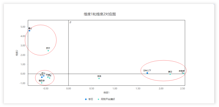 还有一种更高级的多元统计方法叫做‘对应分析’,其是利用‘相关’的原理,比如高学历群体有没有更偏好于京东平台呢,低学历有没有更偏好于拼多多呢。