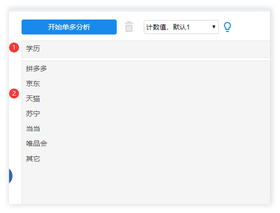 除了CochranQ检验外,有时候需要进行差异对比,比如本次例子中,想对比不同学历的群体,他们选择网购平台的偏好上是否有明显的差异性呢?此时就可使用SPSSAU的‘单选-多选’方法,学历是单选,网购平台偏好是多选,操作如下: