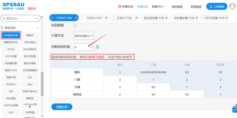 在SPSSAU【综合评价】模块,选择【AHP层次分析法】,选择判断矩阵阶数,填写判断矩阵,点击开始分析按钮,即可得到分析结果,软件操作如下图: