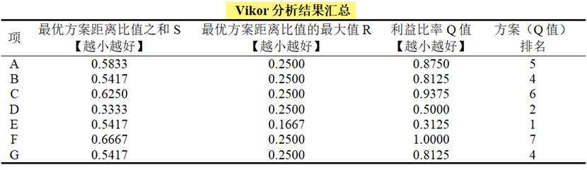 VIKOR(折中妥协法)是一种多属性决策方法,其应用于各种方案的优劣排序,与TOPSIS法功能类似。比如对备选的供应商方案排序,备选的应聘者的各项能力综合评价,找出应聘者的优先适合排序等。SPSSAU输出Vikor法分析结果如下: