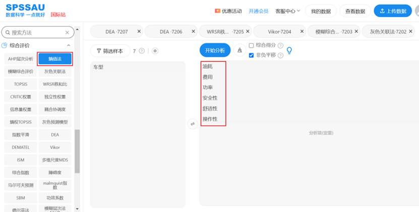 在SPSSAU【综合评价】模块选择【熵值法】,将变量拖拽至右侧相应分析框中,操作如下图: