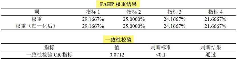 SPSSAU输出FAHP模糊层次分析法权重计算和一致性检验结果如下:点击下方链接跳转至SPSSAU帮助手册: