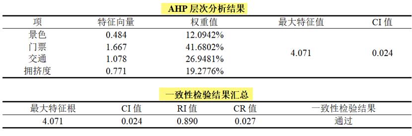 SPSSAU输出层次分析法权重计算和一致性检验结果如下: