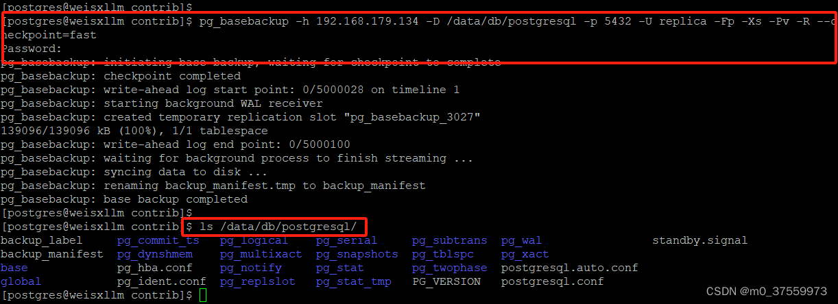 pg_basebackup -h 192.168.179.134 -D /data/db/postgresql -p 5432 -U replica -Fp -Xs -Pv -R --checkpoint=fast