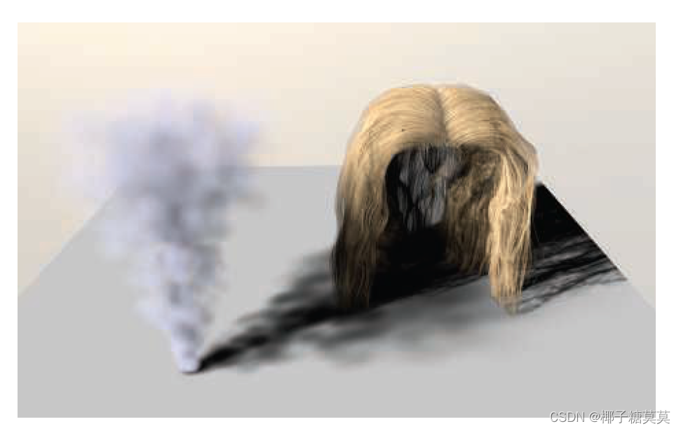 图7.29。头发和烟雾渲染与自适应体积阴影图[1531]。(经马可·萨尔维和英特尔公司许可转载,版权归英特尔公司所有,2010年。)