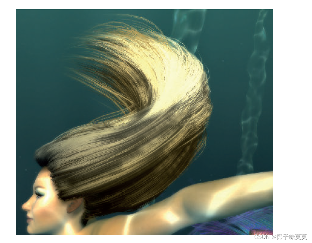 图17.2。使用镶嵌三次曲线的头发渲染[1274]。(图片来自《路娜》演示,由英伟达公司提供。)