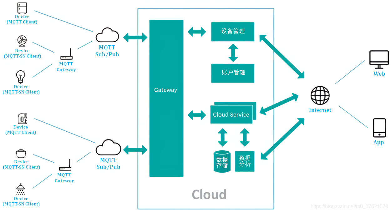 上图左边就是作为MQTT Client 的各种物联网设备(MQTT-SN 是为Sensor Network 设计的运行在UDP 协议之上的MQTT 版本),可以订阅或发布特定主题的消息。中间是IoT Cloud,主要提供设备接入、消息分发(MQTT Broker)、数据管理等服务,为了方便开发者将物联网设备接入IoT Cloud,这些云服务商也提供了相应的SDK,将其整合进我们开发的工程代码中,配置好设备接入和身份认证所需的信息,就可以让物联网设备通过TCP/IP 接入IoT 云平台。我们可以通过PC 或手机登录IoT 云平台账户,管理我们接入的设备、构建我们的监控网络、统计分析监测数据等。